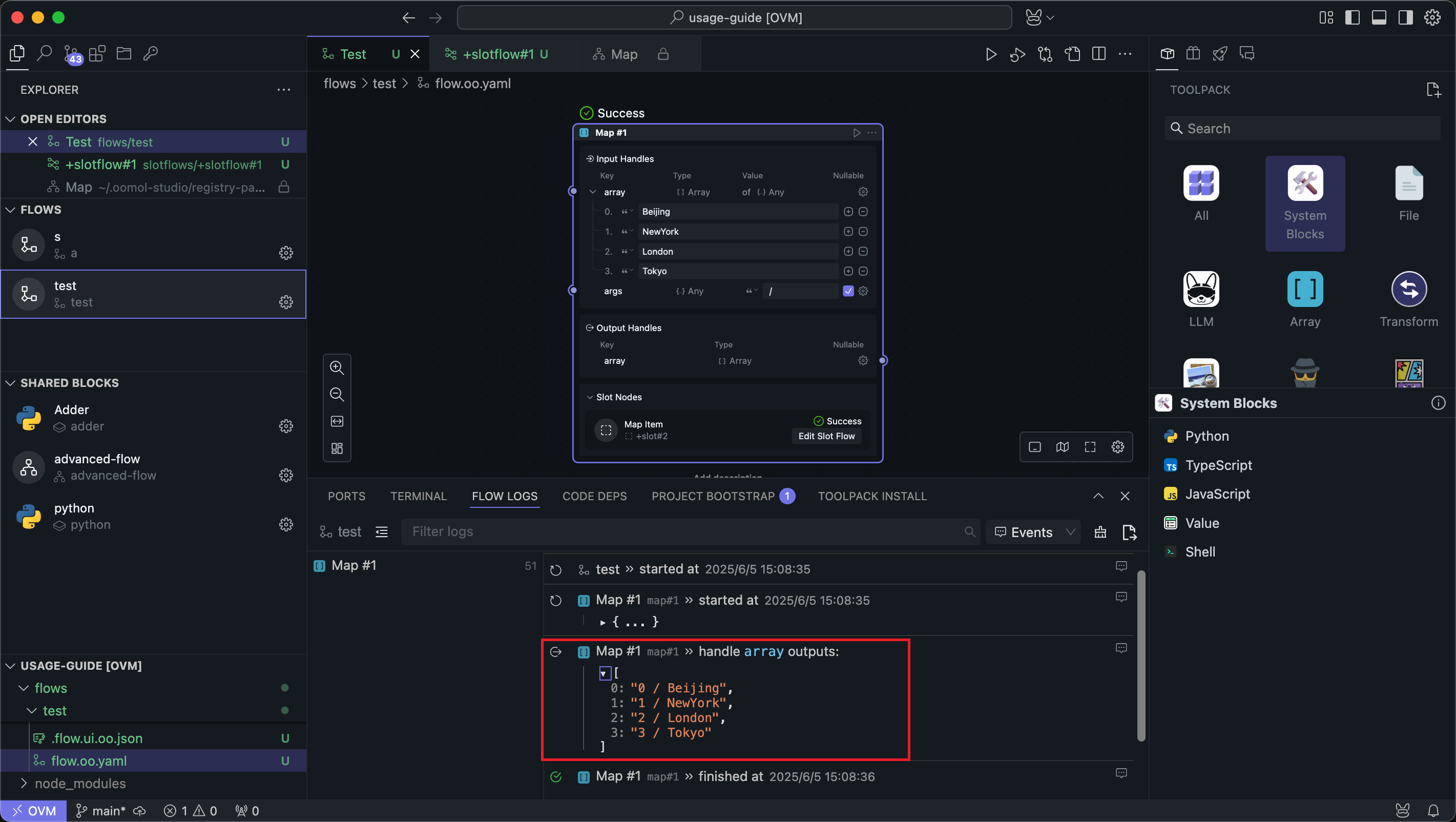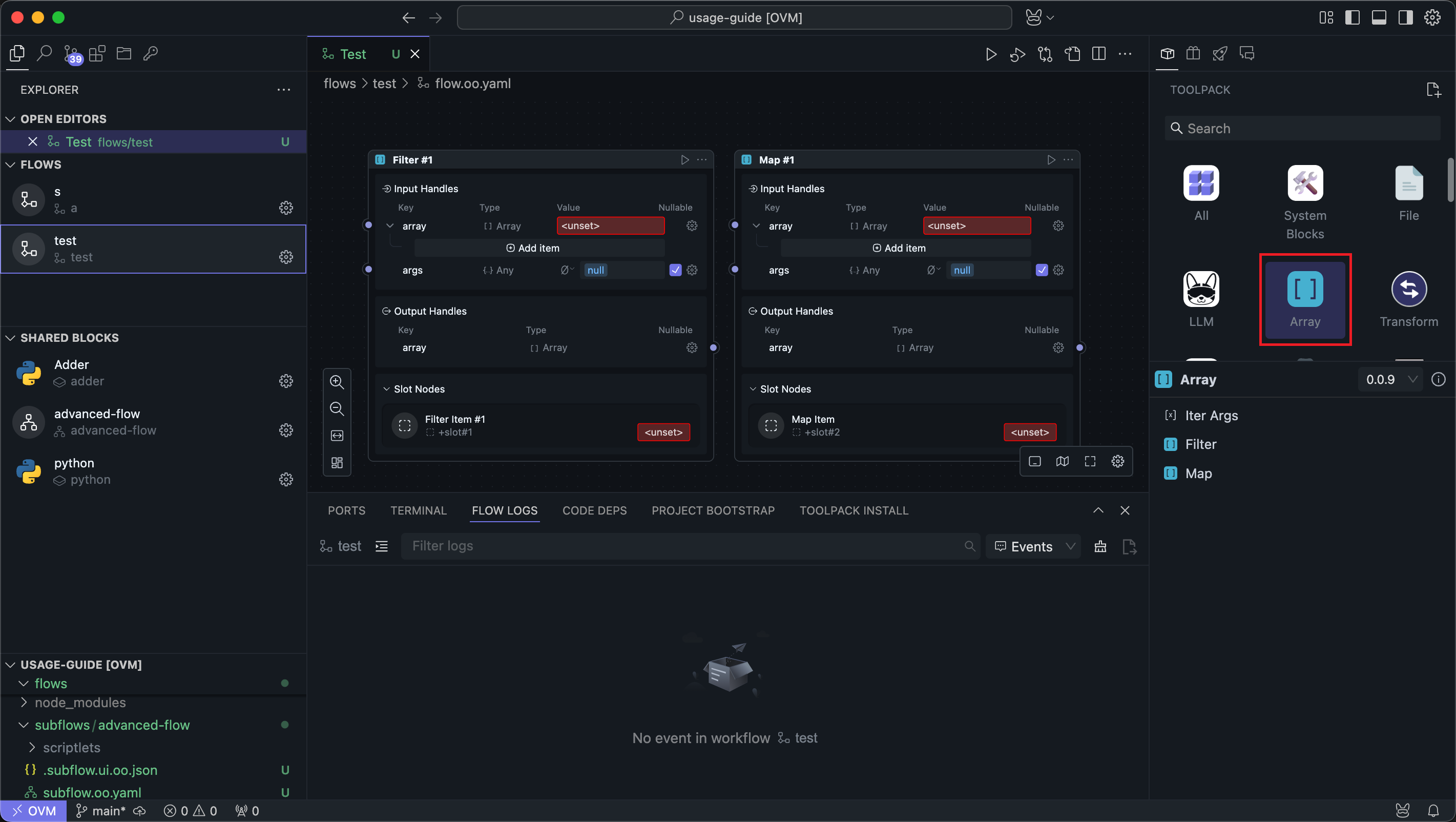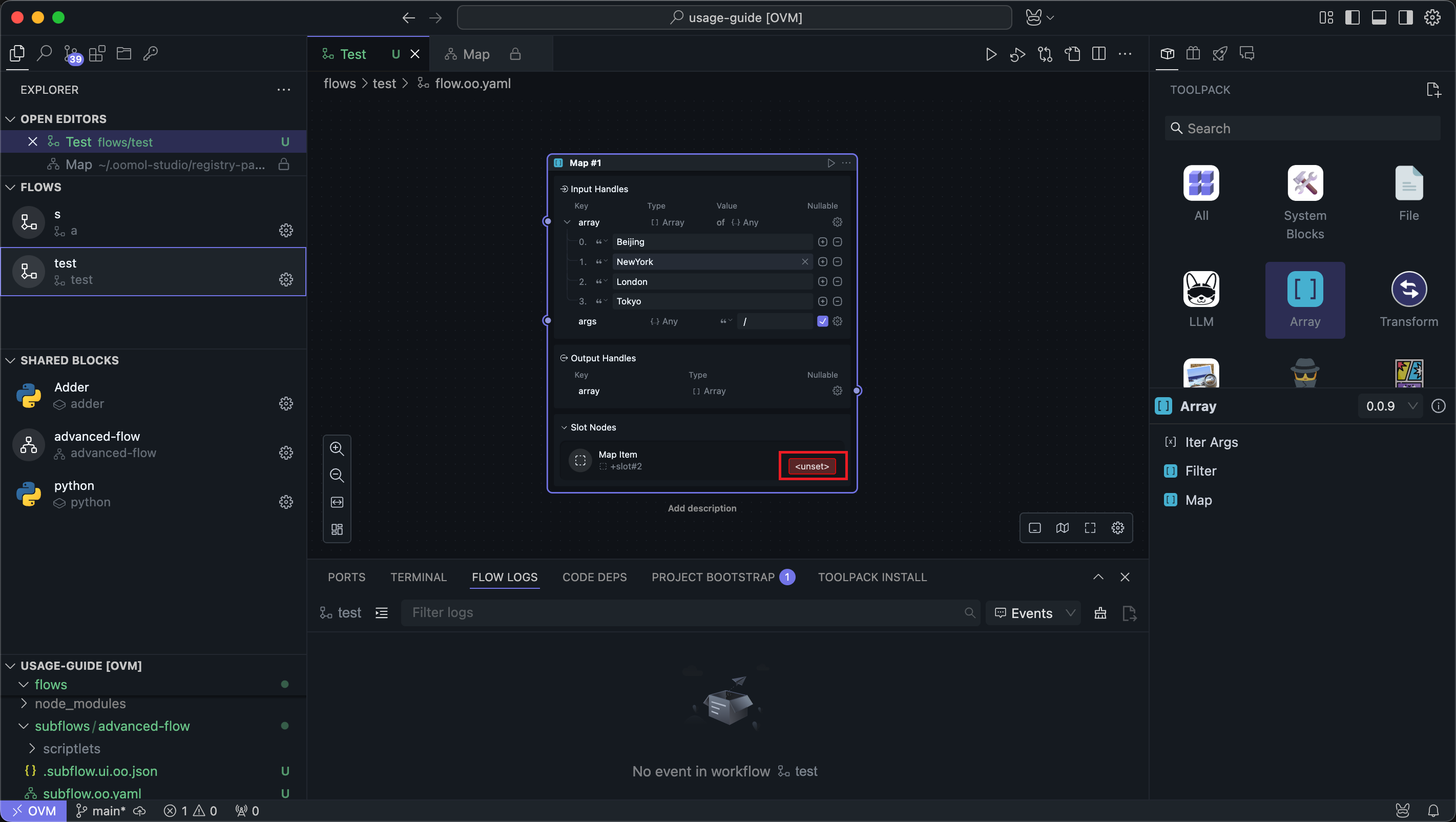 在某些场景下,如果需要将一系列同样类型的数据进行处理,那么你可以使用 OOMOL Studio 内置的数组包: