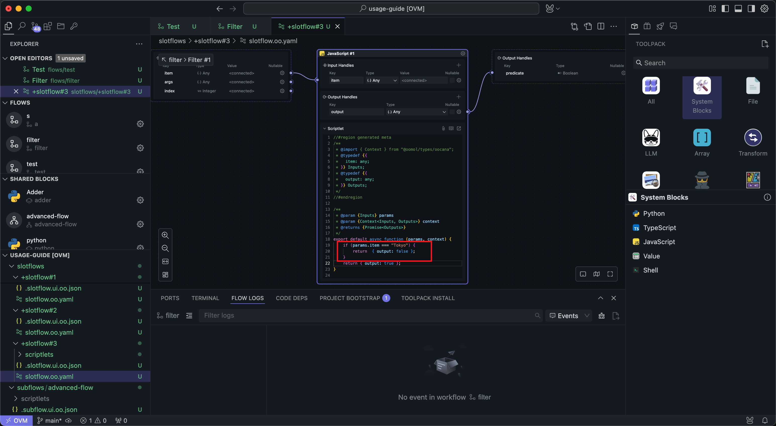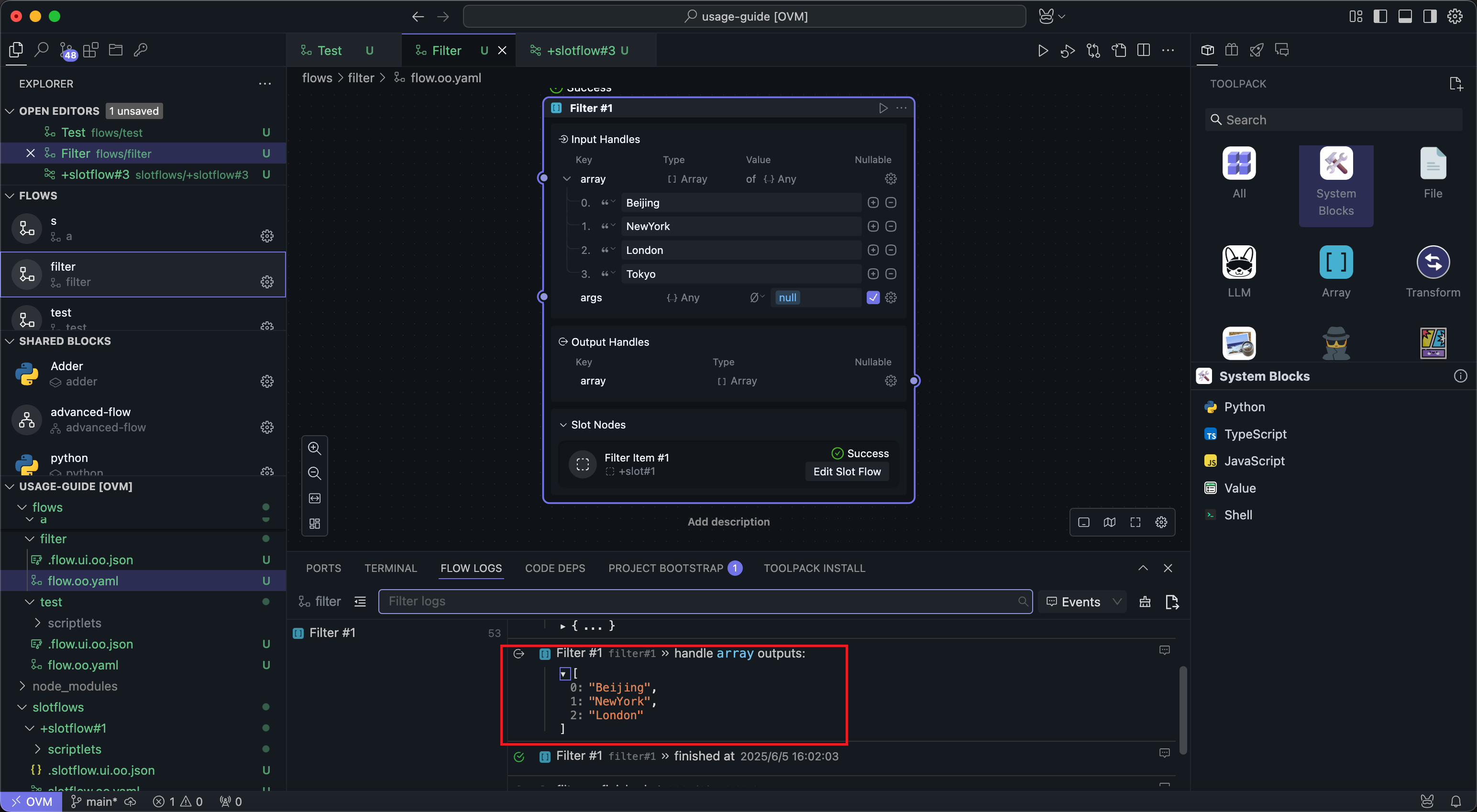 Filter 区块在内部会遍历输入数组的每个元素,然后将每个元素作为参数传递给连接插槽的区块,插槽区块会判断当前元素是否应该选取,最终 Filter 区块会将所有选取的元素合并为一个数组输出。