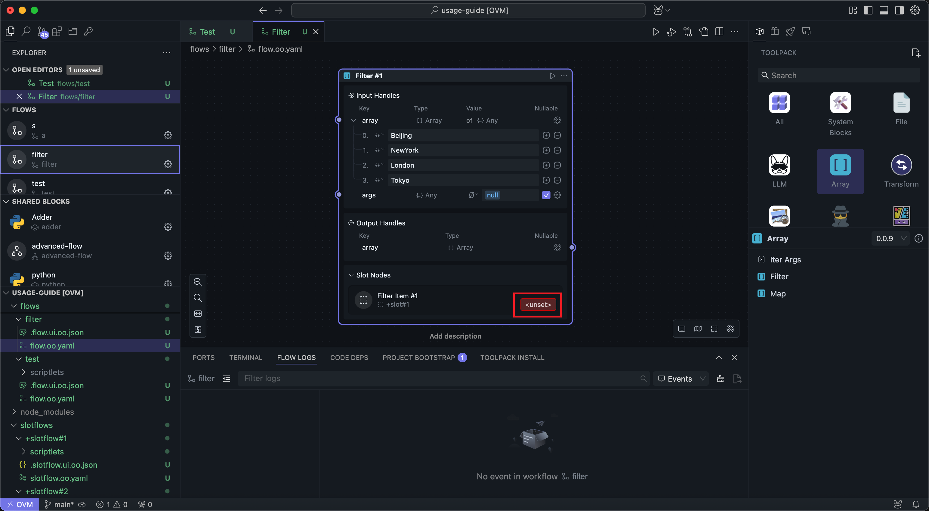 Filter 区块本身是一个子流区块,它的输入是一个数组和一个额外指定参数,同时有一个插槽。