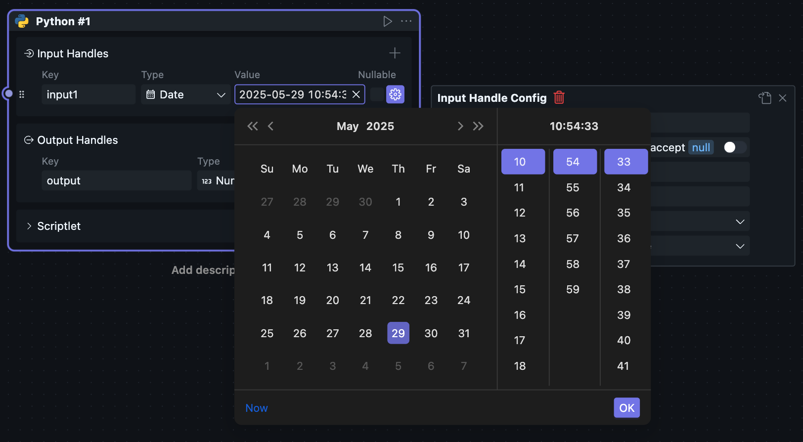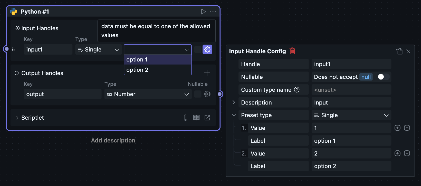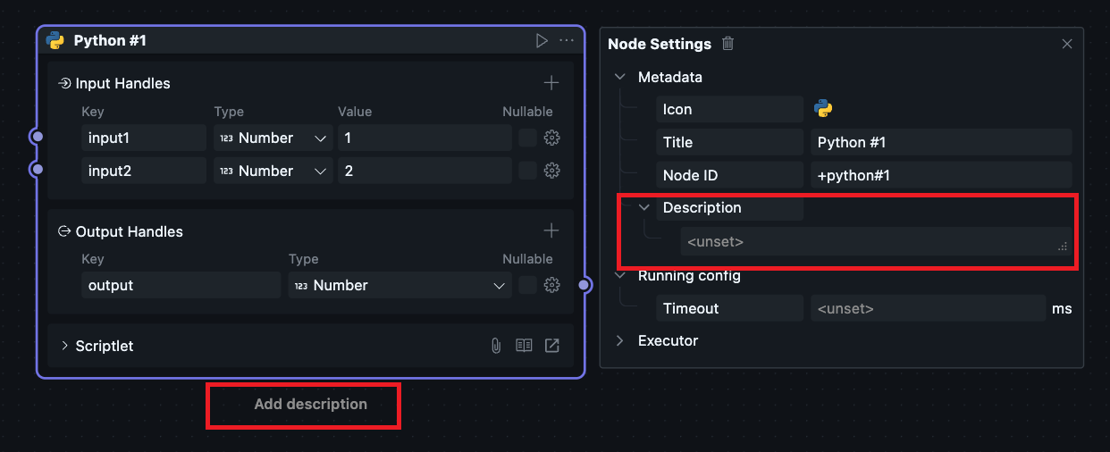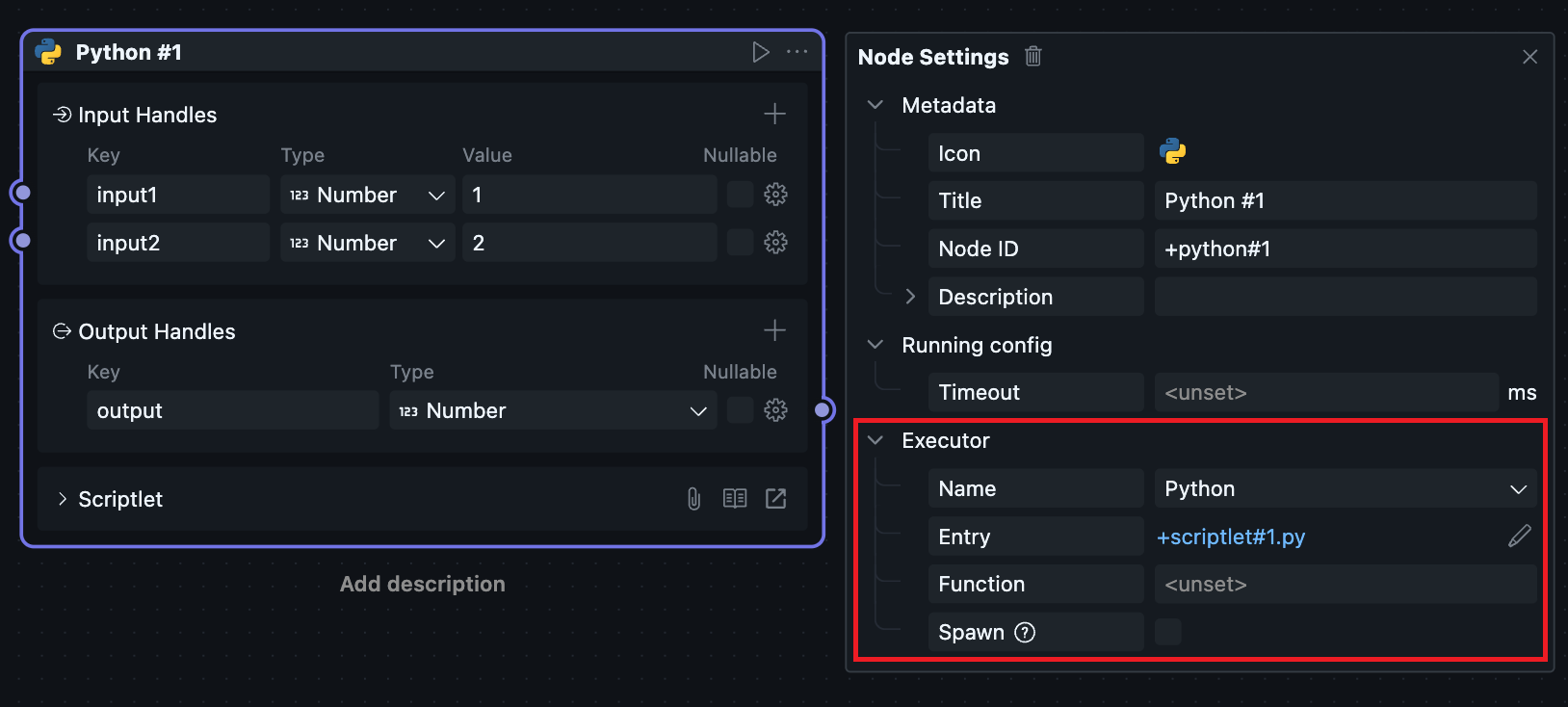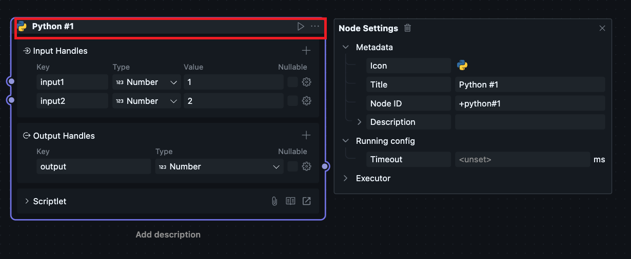 目前执行器由 oomol 团队内部实现,可支持 Python 以及 Node.js 运行环境,因此有对应的两个可选项。