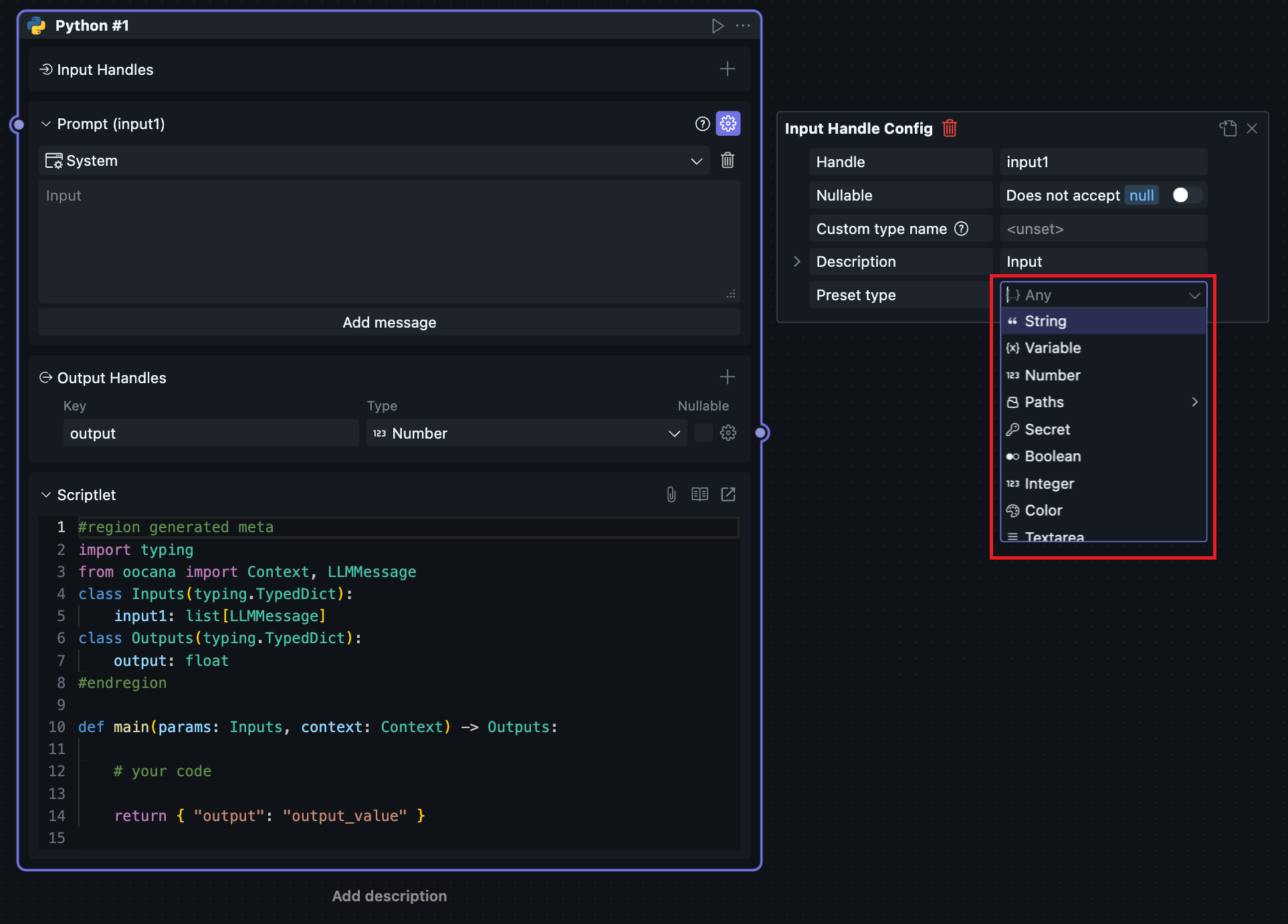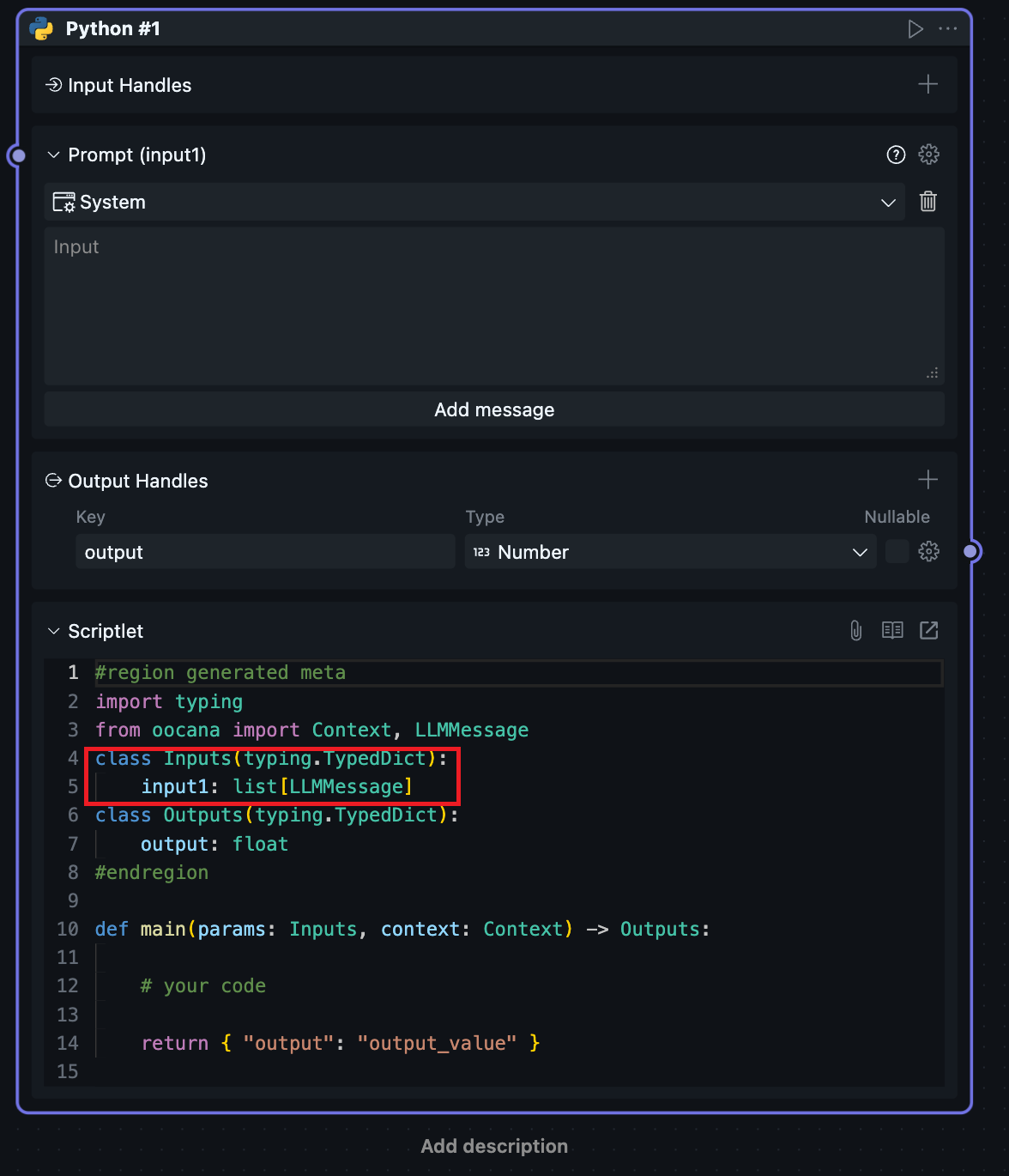 选择 message 后可以看到输出接口类型改变,用户此时可以在 input 接口中获取在界面上配置的提示词参数。