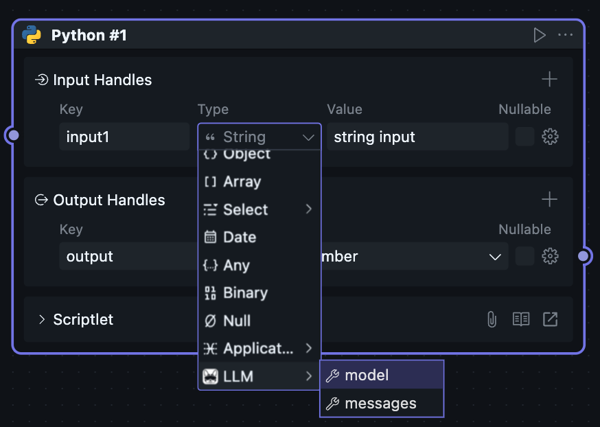 当选择 message 后,输入接口将会转换为 AI 提示词输入,此接口无法连线。