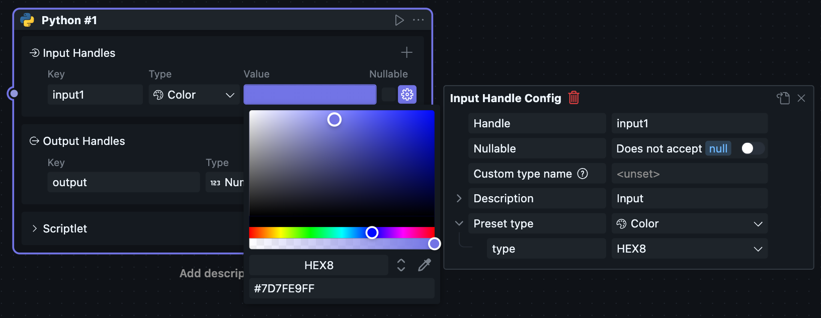 选择颜色类型后可以在数据输入栏中使用颜色选择控件,在子配置项中我们提供了 HEX / HEX8 / HSV / RGB 四种格式的颜色选择。