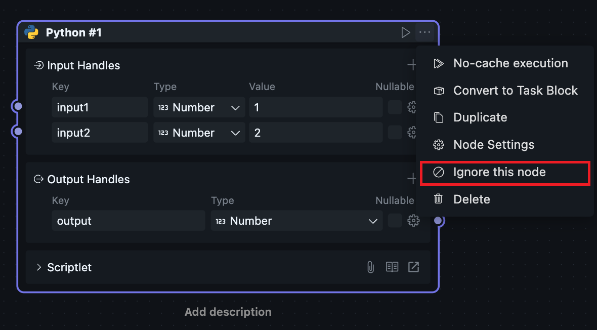 点击“忽略此节点”可以将节点设置为忽略状态。此时运行当前 flow 将会略过此节点和之后的节点。