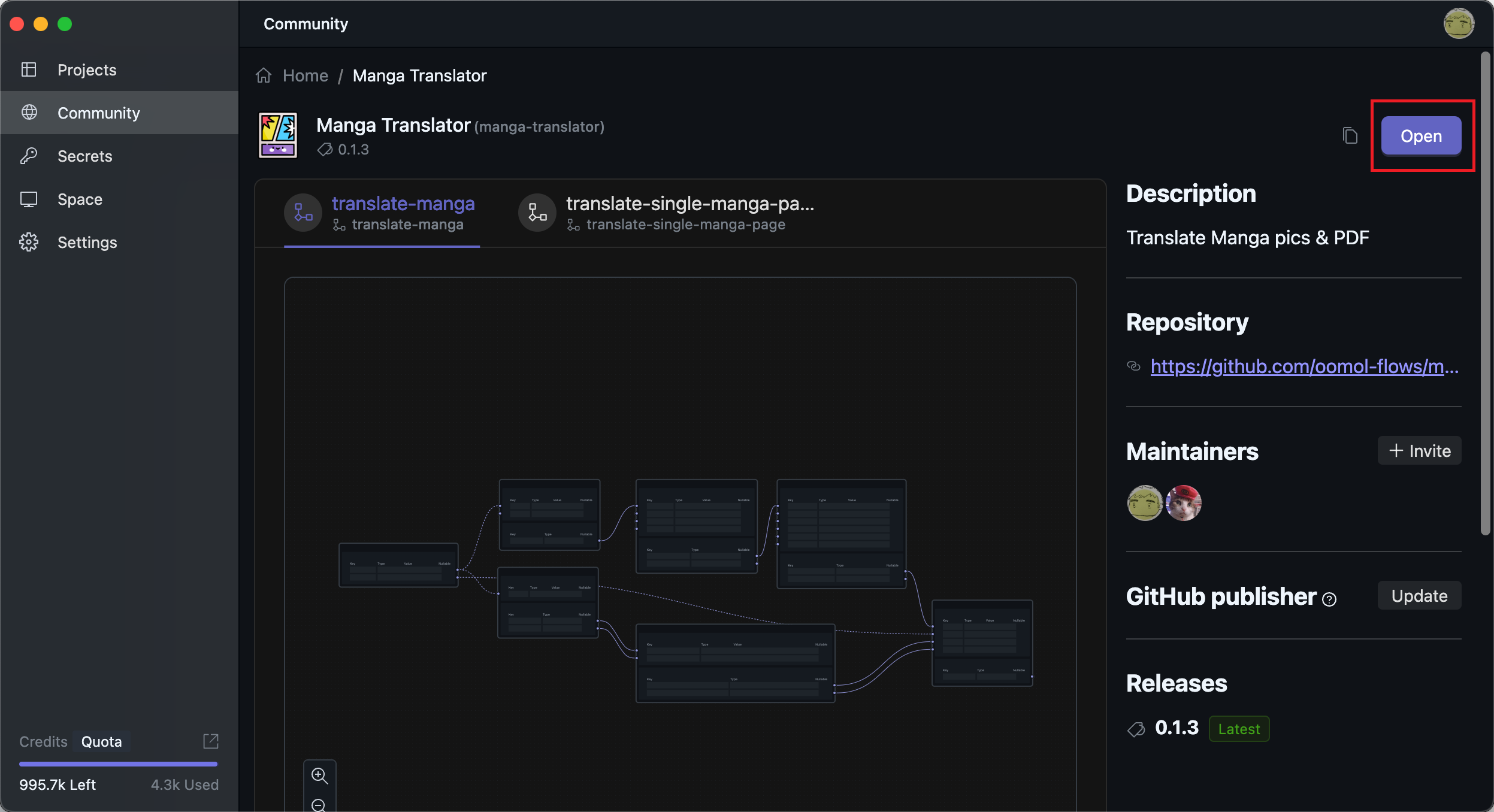 点击按钮会将项目在本地打开,如果是以模板发布的包,打开后包含有所有项目的细节,你可以基于此进行二次开发。否则项目将会只包含流。