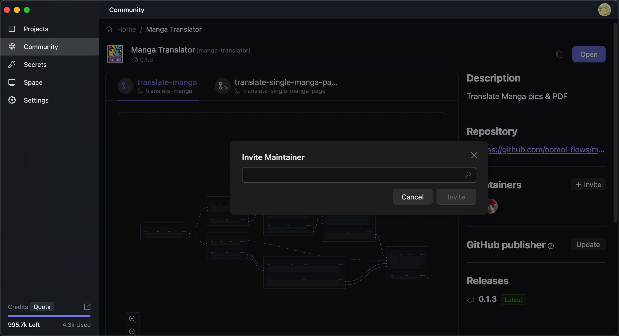 按钮后可以搜索用户并生成邀请连接,将邀请连接发送给指定用户让其接受成为维护者。